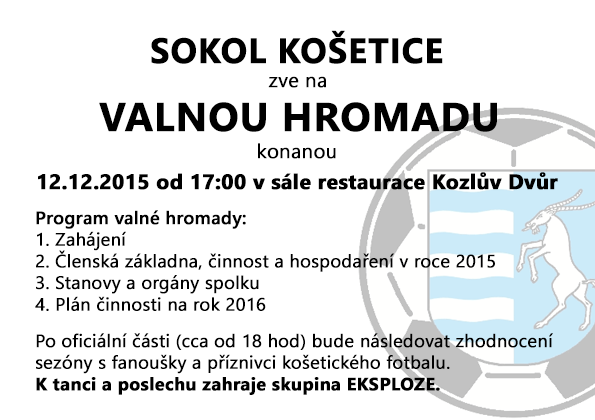 Sokol Košetice zve všechny fotbalisty a fanoušky na valnou hromadu spojenou s oficiální dokopnou konanou v sobotu 12. 12. 2015 od 17:00 v sále restaurace Kozlův Dvůr. Oficiální pozvánku naleznete na tomto obrázku.